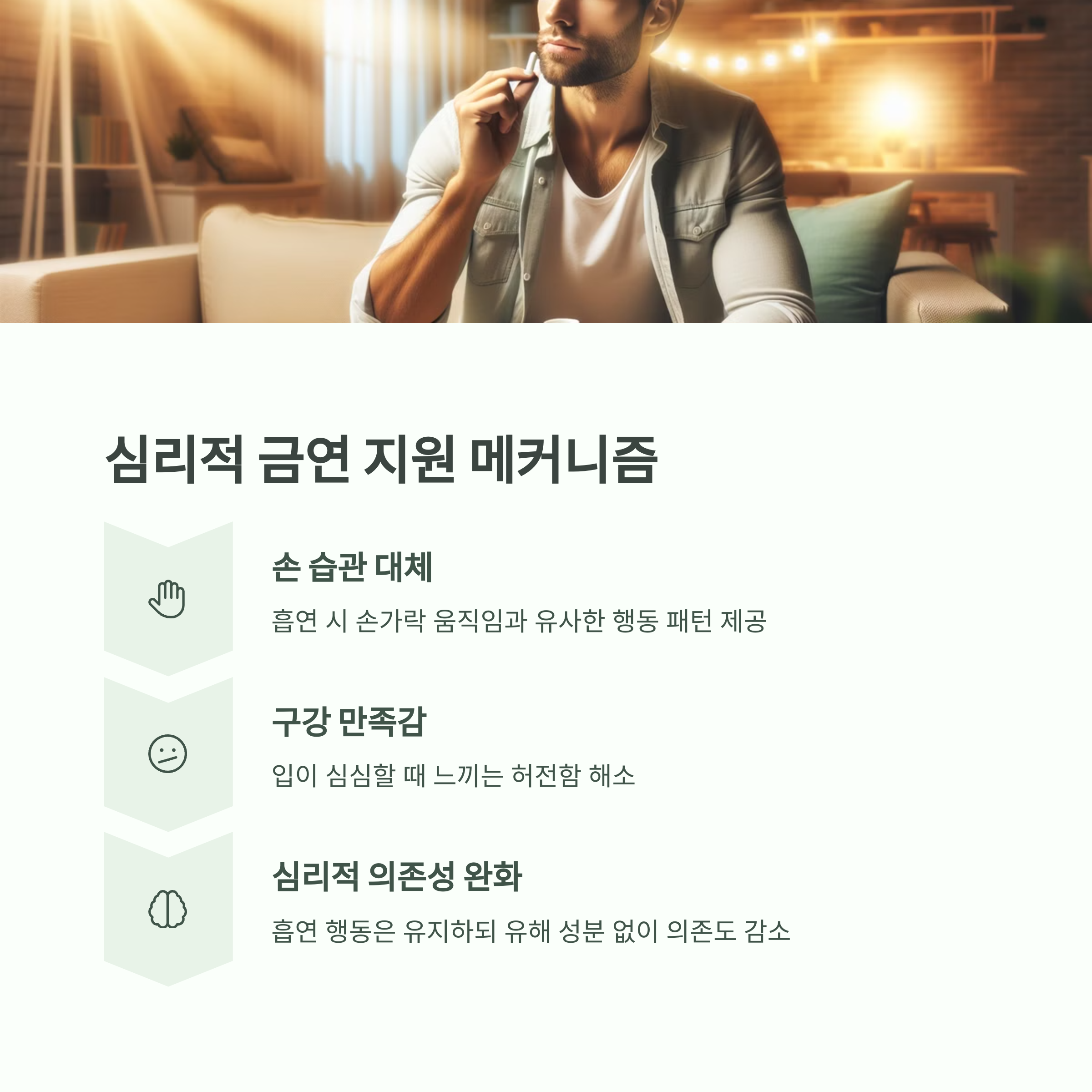 니코틴이 없기 때문에 화학적 중독은 없다고 보지만, 심리적 의존이 생길 수 있습니다. 입·손 습관의 반복 사용이 오히려 새로운 루틴을 만들 수도 있어, 사용 목적을 분명히 해야 합니다.