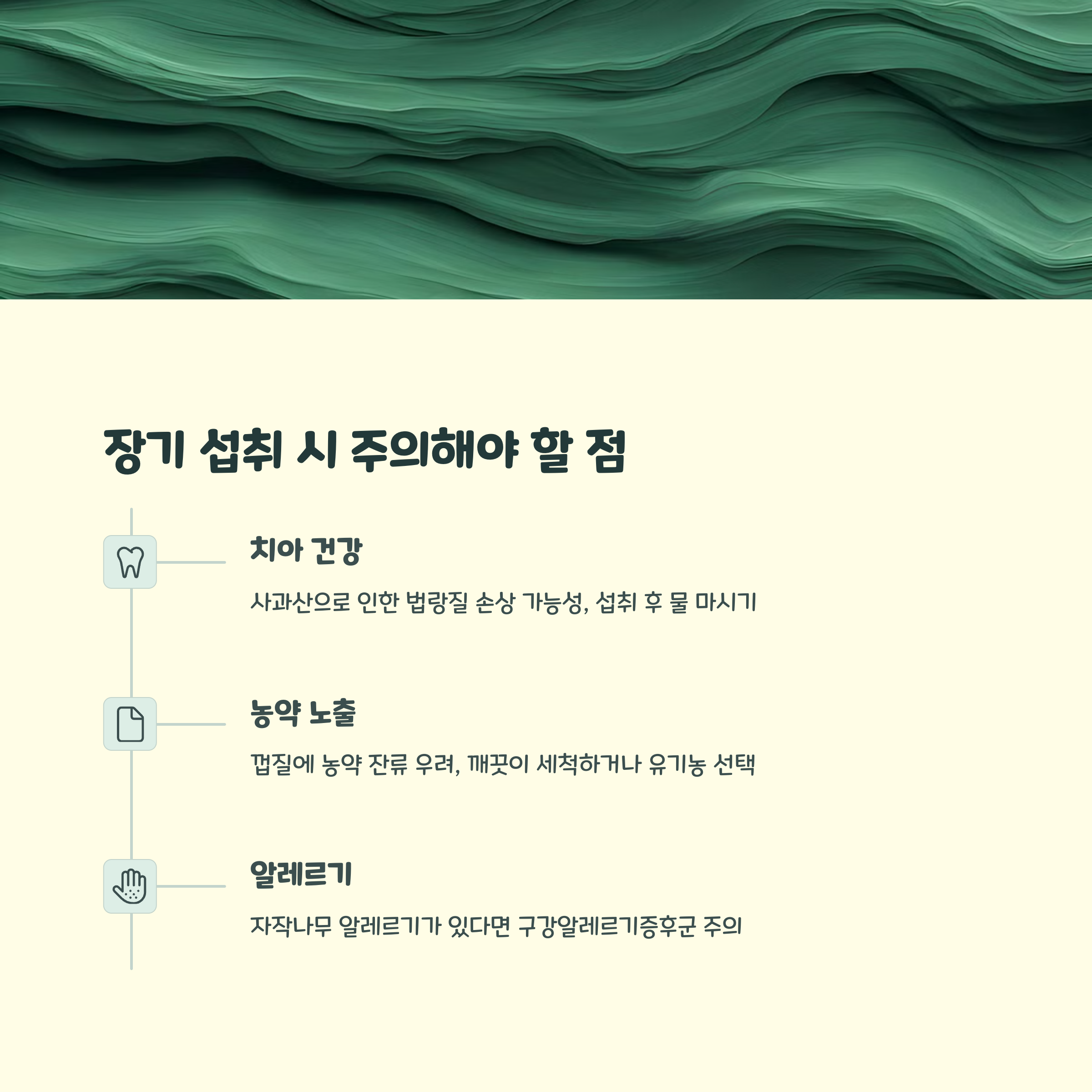 위가 약한 사람에겐 공복 섭취가 부담이 될 수 있어요. 사과의 유기산 성분이 위산을 자극할 수 있기 때문입니다. 식후 30분~1시간 뒤 또는 식간 섭취가 더 적절해요.