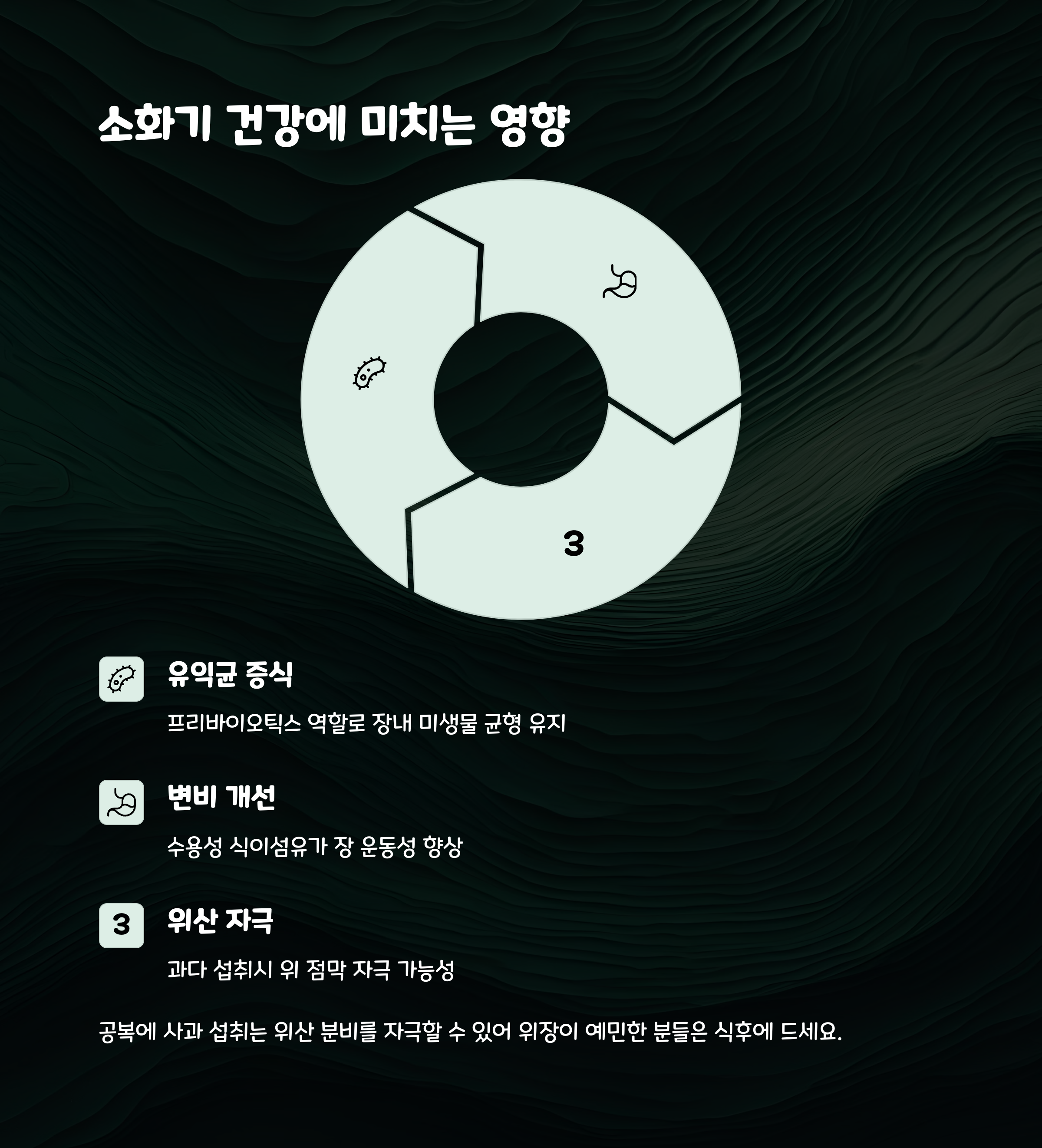 주의: 과민성 대장증후군(IBS)을 가진 분들은 사과의 FODMAP 성분이 복부 팽만을 유발할 수 있습니다. 개인 체질에 따라 조절이 필요해요.