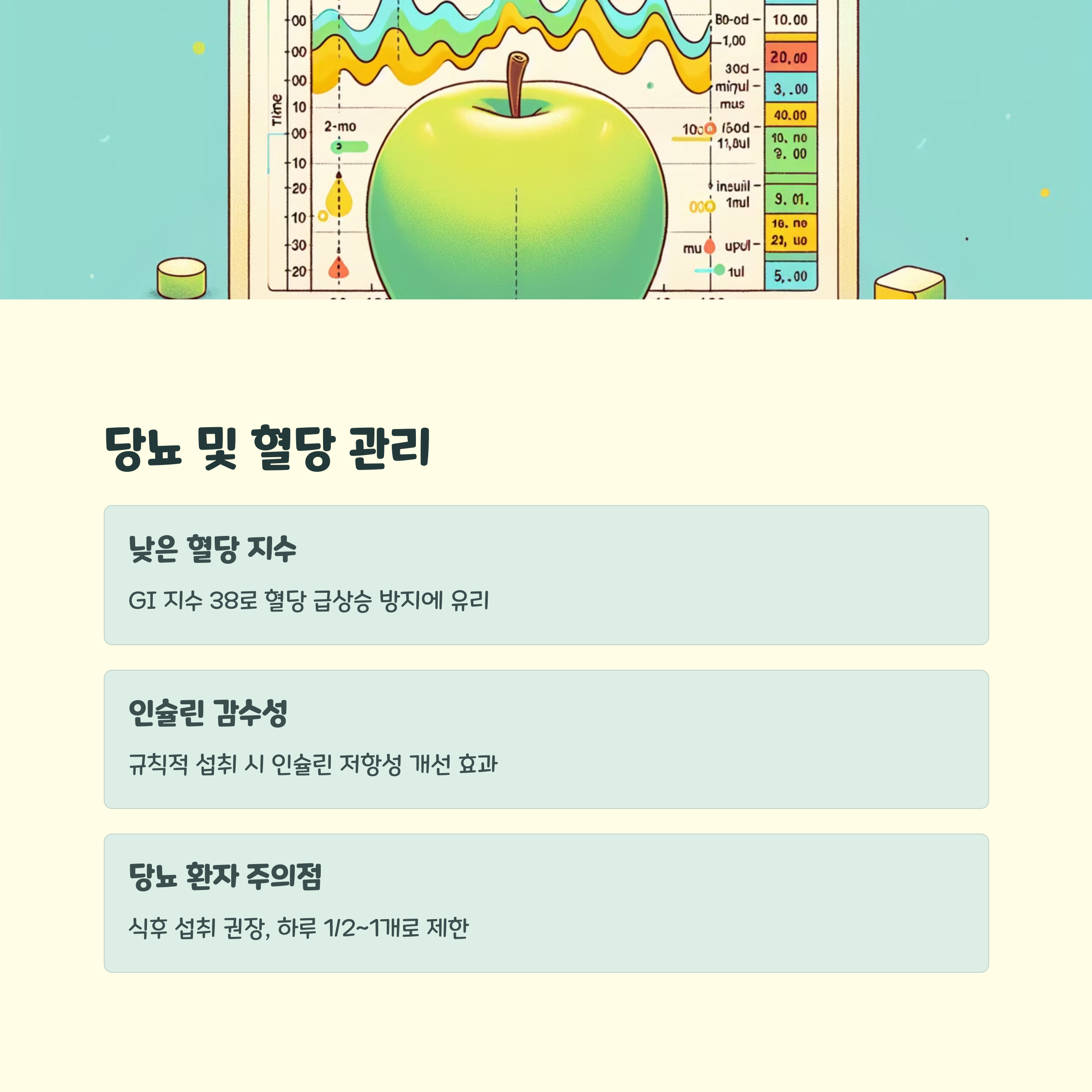 또한 사과는 당지수(GI)는 낮지만 과당 함량이 상대적으로 높기 때문에, 혈당 조절이 필요한 당뇨 환자라면 하루 섭취량을 1개 이하로 조절하는 것이 바람직합니다. 껍질째 먹으면 혈당 상승을 더 억제할 수 있어요.