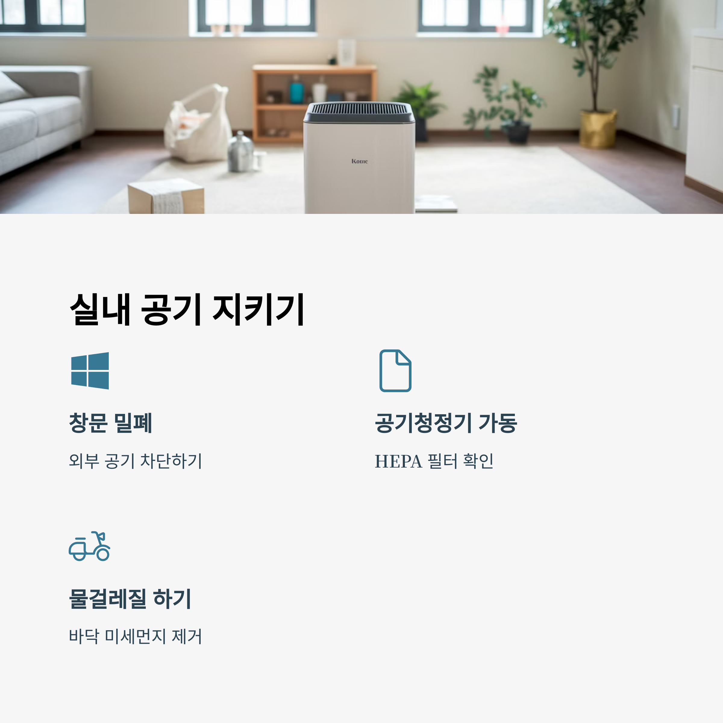 - 창문을 닫고 외부 공기 유입을 최소화하세요.