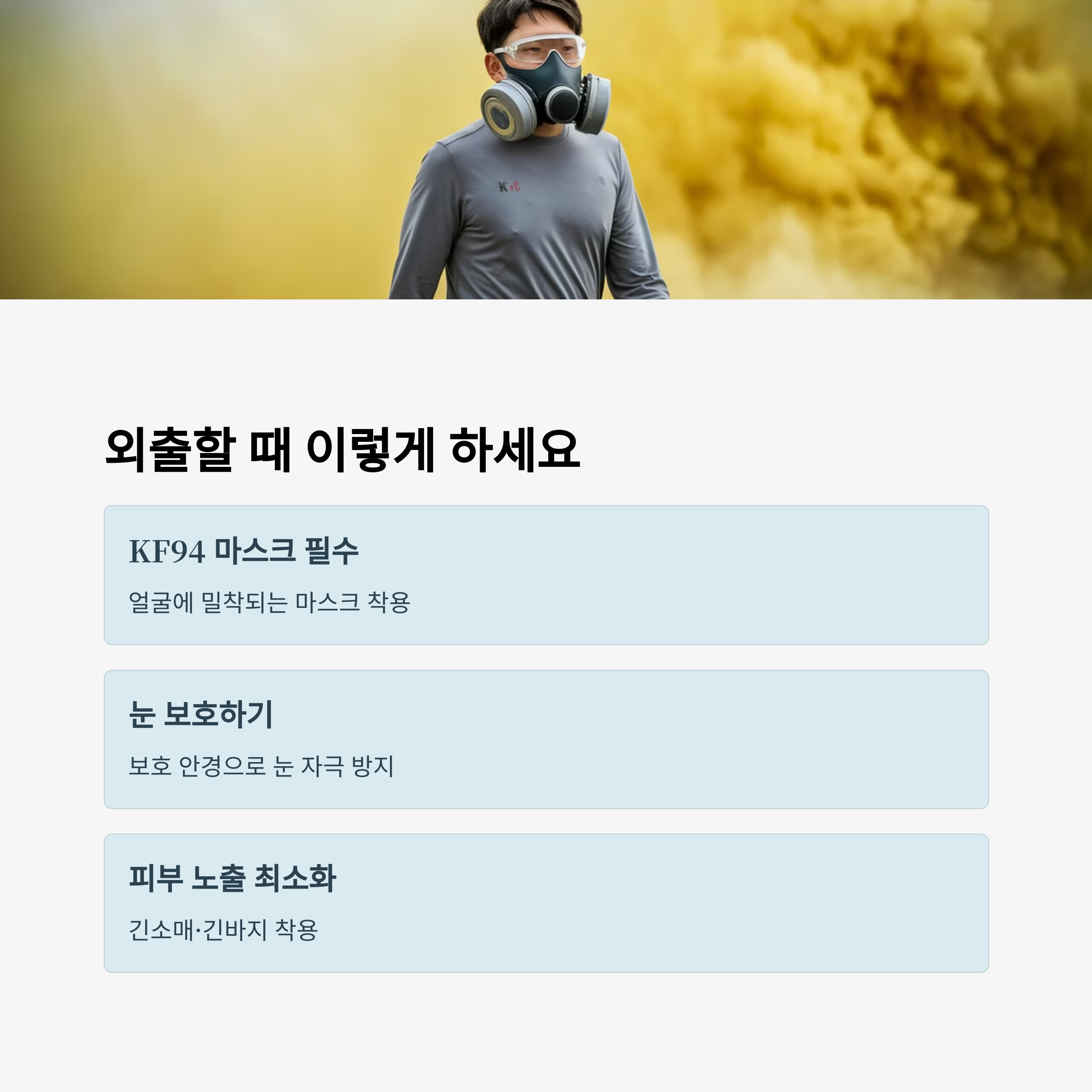 부득이하게 황사가 심한 날 외출해야 할 경우, 반드시 철저한 대비가 필요합니다. 보호 장비를 갖추고, 외출 후에는 즉시 몸을 깨끗이 씻는 것이 중요합니다.