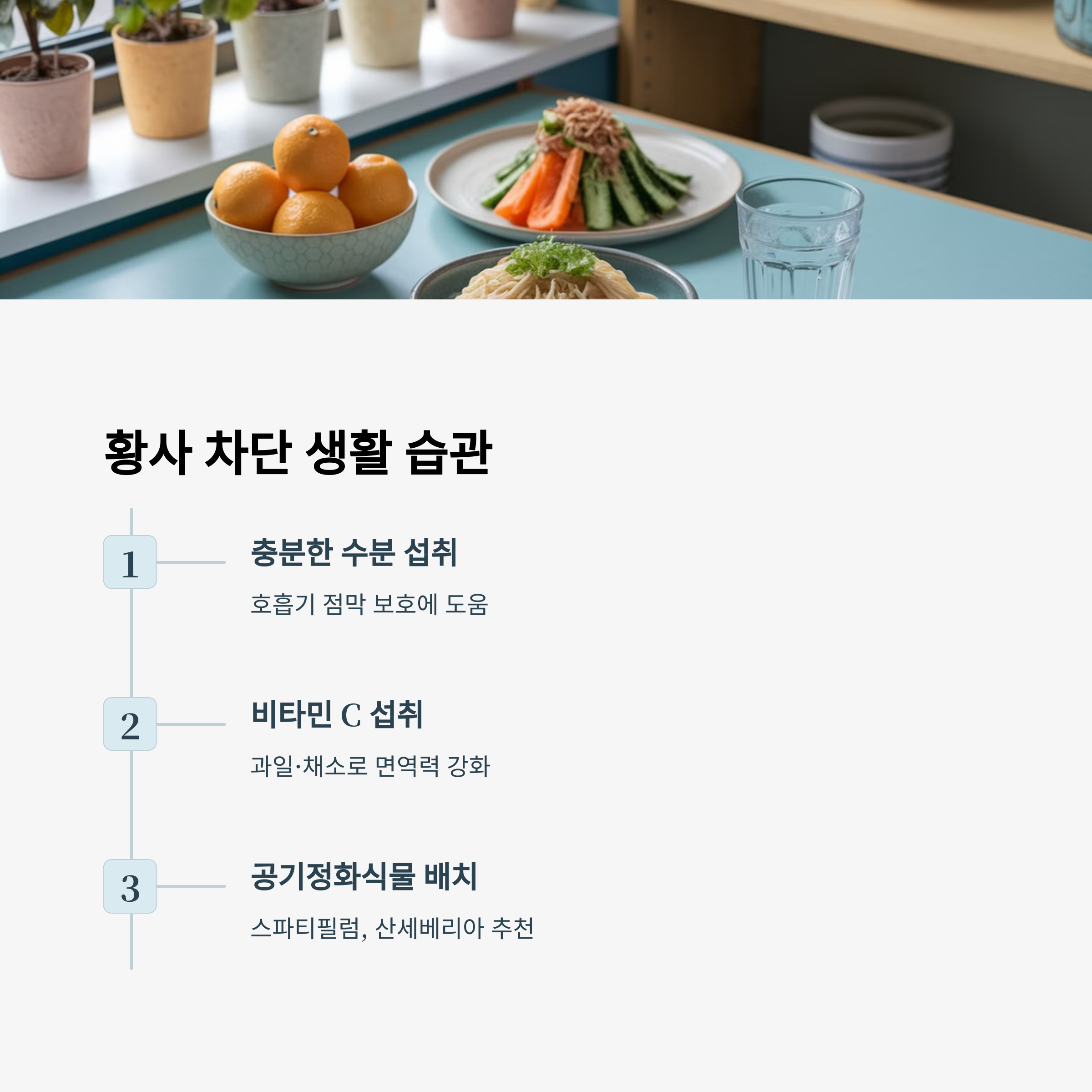황사가 심한 날에는 외출을 줄이고 실내에서도 공기 질을 철저히 관리하는 것이 중요합니다. KF94 마스크를 착용하고, 손 씻기와 세안 등 위생관리를 철저히 하는 것이 건강을 지키는 기본적인 방법입니다. 또한, 기관지 건강을 돕는 음식 섭취와 충분한 수분 보충도 잊지 마세요.