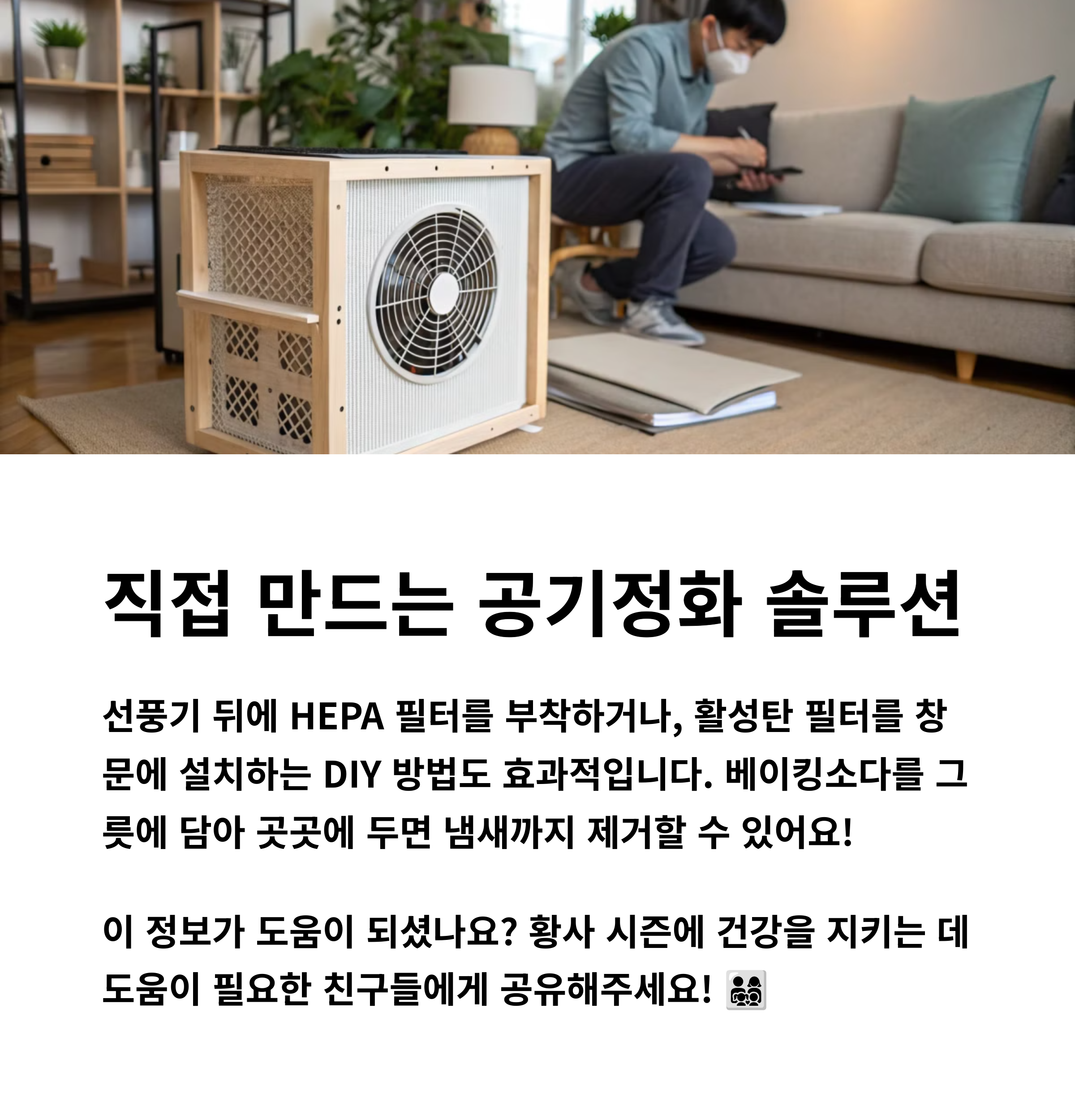 이처럼 간단한 방법을 활용하면 비용을 절감하면서도 **실내 공기 정화 효과**를 높일 수 있습니다. 특히 황사나 미세먼지가 심한 계절에는 DIY 필터를 추가로 활용해 보세요.