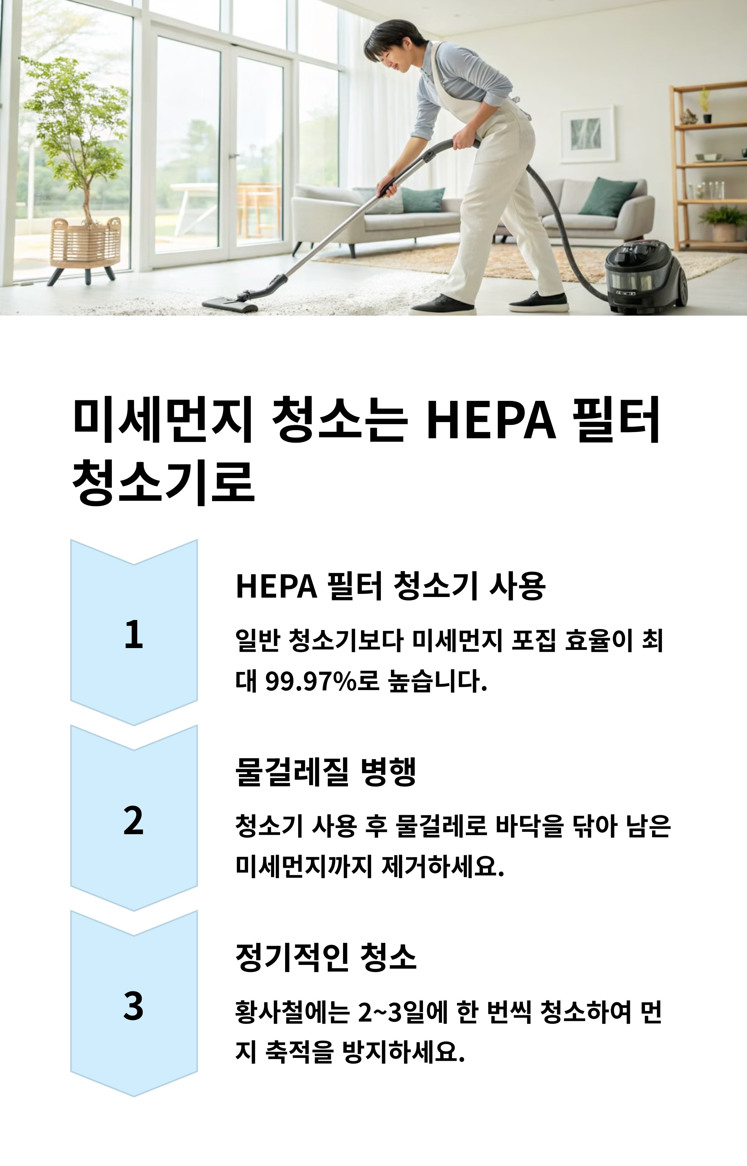 - **HEPA 필터 장착 청소기 사용** → 먼지가 다시 공기 중으로 퍼지지 않도록 고성능 필터를 장착한 청소기 사용
