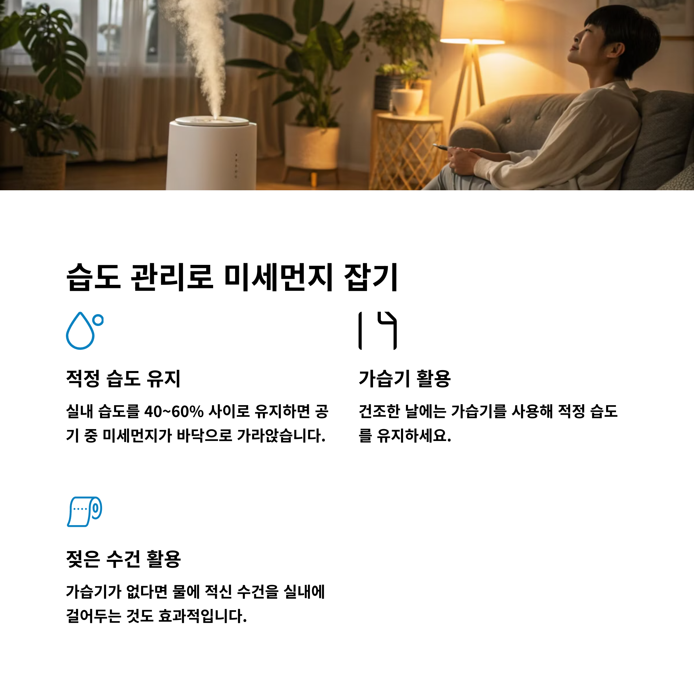 - **정전기 방지** → 습도가 낮으면 먼지가 쉽게 달라붙기 때문에 바닥과 가구 표면에 물걸레 청소 필수