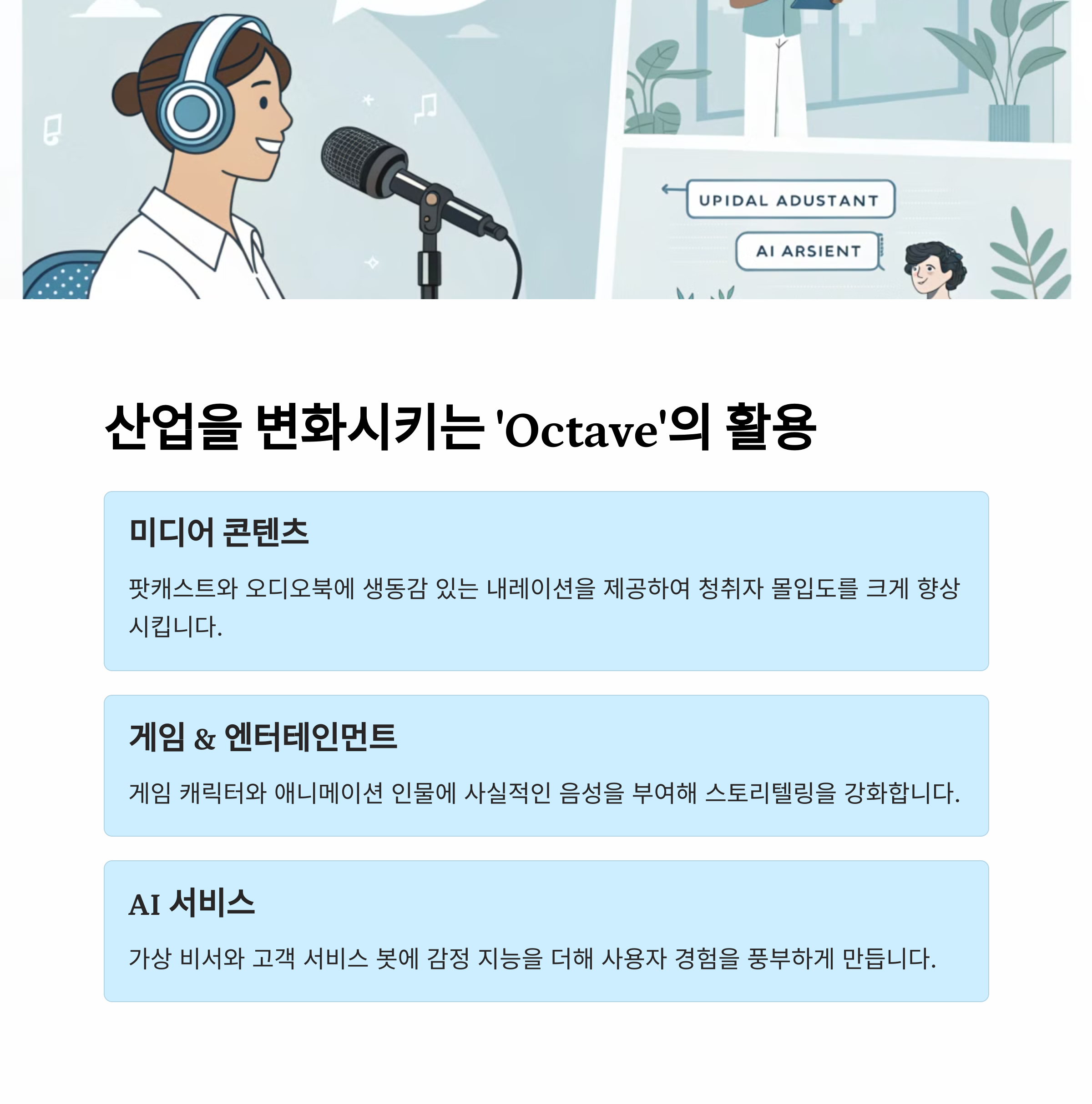 기존 AI 음성은 단조로운 표현이 많았지만, 'Octave'는 감정과 개성을 반영하는 다양한 음성을 제공합니다. 이를 통해 게임, 애니메이션, 오디오북 등의 활용성이 크게 향상됩니다.